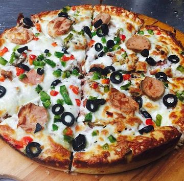 Beef/Chicken Smoky Jambon, Beef Sausage, Green Pepper, Mushroom, Black Olives, Mozzarella Cheese